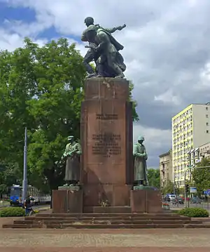 The Monument to Brotherhood in Arms (Polish: Pomnik Braterstwa Broni) was erected in Vilnius Square in Warsaw's Praga district, in 1945, to commemorate the joint fight of Polish and Soviet soldiers against Nazi Germany.[1] In 2011, it was temporarily taken down during the construction of an underground railway station and sent to restorers. However, when it was about to be reinstalled, a minority of Praga's residents objected, as they perceived the monument as a remnant of the Communist era. In surveys carried out by the city council and Gazeta Wyborcza in 2012 and 2013 respectively, the majority of Warsaw's residents said they would like the monument to be returned to its original place or placed somewhere nearby.[2][3] In 2015, the Warsaw City Council overturned its earlier decision to return the monument and made the removal permanent.[4]