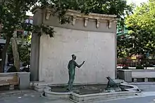The project of the monument was authored by Víctor d'Ors, son of Eugenio.[1] The front side of the monument facing the Prado Museum displays a bronze sculptural group emerging from a fountain; it consists of a female allegory (designed by Cristino Mallo) stopping a four-legged creature variously described as a "small dragon",[2] a "pet stegosaurus"[1] or a "baroque and spontaneous eruption".[3]