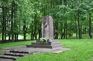 In 1944, the Red Army launched the Baltic Offensive towards the Gulf of Riga. A volunteer corps of town inhabitants was formed to protect the town against the Red Army. The volunteer forces, numbering about 300, and outnumbered tens to one, managed to hold back the offensive for six weeks, from 28 July to 14 September 1944.[1][5] The Soviet bombardment of 11–14 September 1944 destroyed 100 buildings in the town and damaged more than 300 – destroying more than one third of Bauska. Most of the defenders died in the desperate fighting.[6]