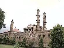 Jami Masjid is located about 150 feet (46 m) east of the city walls (Jahdnpandh). It dates to 1513; construction was carried out over 125 years.[9] The mosque is a place of pilgrimage for those who seek blessings from the pir who is buried in one corner of the mosque gardens.[10] The two impressive towers at the entrance of the masjid and the fine blend of Hindu and Islamic architecture are stated to constitute a fine model of "symmetrical composition, perfection of details and decorative beauty particularly intricately carved ceiling of prayer hall."[11]