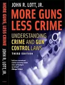 More Guns, Less Crime is a book by John R. Lott Jr. that says violent crime rates go down when states pass "shall issue" concealed carry laws. He presents the results of his statistical analysis of crime data for every county in the United States during 29 years from 1977 to 2005. Each edition of the book was refereed by the University of Chicago Press. As of 2019, the book is no longer published by the University of Chicago Press. The book examines city, county and state level data from the entire United States and measures the impact of 13 different types of gun control laws on crime rates. The book expands on an earlier study published in 1997 by Lott and his co-author David Mustard in The Journal of Legal Studies[1] and by Lott and his co-author John Whitley in The Journal of Law and Economics, October 2001.[2]