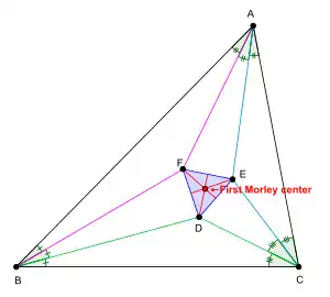 Let △DEF be the Morley triangle of △ABC. The centroid of △DEF is called the first Morley center of △ABC.[1][3]
