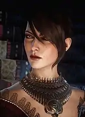 Morrigan's facial features was based on a model named Victoria Johnson.[10] For her appearance in Dragon Age: Inquisition, the design team had concept several outfits designed for different climates, though ultimately her traditional outfit from her days in the Korcari Wilds was favored. During her initial appearance at a ball in Inquisition, Morrigan wears a black and purple gown decorated with feathers and black lace, and bound by a leather corset. Morrigan's gown is designed in the style of the Orlesian court, but the materials as well as palette of black and purple are reminiscent of her Origins outfit.[11] The design of her dress "slyly layers the natural upon the ostentatious", and is a "cavalier, twitchy thumb to the nose of the pastel hues favoured by Orlesian fashion".[12] Her son Kieran is dressed in Orlesian finery which evokes her trademark appearance.[11]