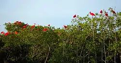The park is inhabited by numerous species of birds, about 266, as report by Cuare Wildlife Refuge. Because Morrocoy National Park and Wildlife Refuge Cuare are located in the same geographic area, it is inferred that the park should have a similar number. Some notable species are: the osprey; vulnerable species such as flamingo, palette heron, pelican; species of birds whose preferred habitat is the mangrove nesting and resting such as, Neotropic, Chusmita or white Garcita, the helmeted cockaded, the amazona real parrot, the red scarlet ibis, pechiblanca heron (tricolored heron); and species with restricted distribution such as the frigatebird or earwig. Tues mangroves of Morrocoy Bay are excellent bird sanctuaries, especially on the island of Pájaros located in the central area of the park, which is covered with mangrove cay.