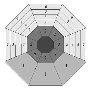 The next ring illustrates Pseudo-Dionysius's angelic hierarchies with captioned images. At the centre is Christ Blessing, with an open book in his hand and flanked by red seraphim and blue cherubim, with the closest to him distinct in having three pairs of wings. Next, alternating from left to right and separated by small columns, are two pairs of each kind of angel. These all have two wings and are all identical to their pair, except for those on the same axis as Christ which are mirror images of each other: