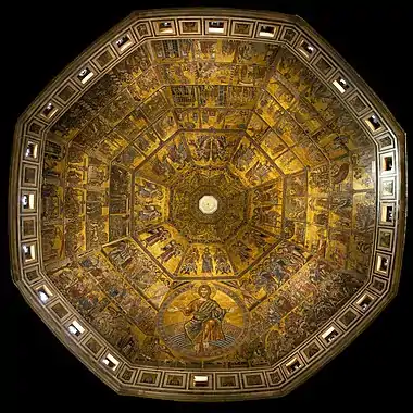 The Mosaic ceiling of the Florence Baptistery is a set of mosaics covering the internal dome and apses of the Baptistery of Florence. It is one of the most important cycles of medieval Italian mosaics, created between 1225 and around 1330 using designs by major Florentine painters such as Cimabue, Coppo di Marcovaldo, Meliore and the Master of the Magdalen, probably by mosaicists from Venice.