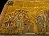 The three segments above the altar show the Last Judgement, with the centre almost completely filled by a figure of Christ the Judge seated on the Circles of Paradise and holding out his hands, showing his wounds from the Crucifixion, one facing palm up and the other palm down, directing souls to heaven and hell respectively. The large feet also show the wounds from the Crucifixion – their staggered pose, the robe's complex pleats and the side view of the legs avoid a rigid frontal effect, highlighted with golden tesserae. The cruciform halo includes mirror-like enamel cubes, also included in the border of the mandorla around Christ. Either side of the mandorla are three parallel registers, with two almost symmetrical hosts of angels at the top bearing symbols of Christ's passion and attributes of the Judgement, along with two angels sounding the last trumpet of the Apocalypse summoning the dead from their graves at Christ's feet.