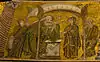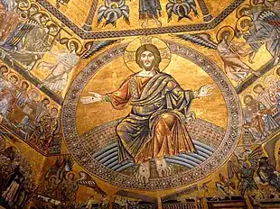 According to Pietro Toesca, the artist behind the first register was the same brother Jacopo who worked on the rectangular apse, assisted by Venetian masters.[2] The angelic hierarchies are traditionally attributed to Andrea Tafi and Apollonio, though Ragghianti argues Coppo di Marcovaldo produced the cartoon for the figure of Christ and the Master of the Maddalena that for the Powers.[2]