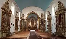 The result of successive interventions still preserves a recognizable general Baroque plan, with Rococo elements in the decoration. Its thick walls and imposing appearance resemble a fortress, which has been interpreted as a reflection of the period of border disputes between the Portuguese and Spanish territories in South America. It has been highly praised for its monumentality and the beauty of its carved decoration, which some authors attribute to Francisco da Costa Senne.[5][7] According to Mariza Lópes, the high altar, whose style differs from the others, is by Bartolomeu Teixeira Guimarães.[7] Marcia Bonnet says that it resembles - in structure, distribution of elements, and ornamental motifs - several other altarpieces located in different villages of the Captaincy of São Vicente, but does not identify an author.[10]