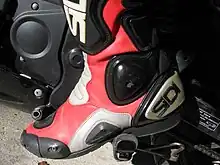 Motorcycle boots are associated with motorcycle riders and range from above ankle to below knee boots. They have an outside of a typical boot but a low heel to control the motorcycle. To improve motorcycle safety, motorcycle boots are generally made from a thick, heavy leather and may include energy absorbing and load spreading padding, metal, plastic and/or composite materials to protect the motorcycle rider's feet, ankles and legs in an accident. For use in wet weather, some boots have a waterproof membrane lining such as Gore-Tex or SympaTex.