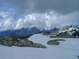 Pali Dome, located north and northeast of Mount Cayley, is an eroded volcano in the central MCVF. Like Cauldron Dome, it consists of two geological units. Pail Dome East on the eastern end of the Powder Mountain Icefield consists of andesite lava flows and small amounts of pyroclastic material. Most of the lava flows form gentle topography at high elevations but terminate in finely jointed vertical cliffs at low elevations. Volcanism probably began at least 25,000 years ago but it could have initiated much earlier.[24] The most recent eruptions produced a series of lava flows when the vent area was not covered by glacial ice. However, the flows show evidence of interaction with glacial ice in their lower units, indicating that they were erupted about 10,000 years ago during the waning stages of the Fraser Glaciation. Ice-marginal lava flows at Pail Dome East form cliffs that reach heights of up to 100 m (330 ft).[24] Pali Dome West consists of at least three andesite lava flows and small amounts of pyroclastic material; its vent is presently buried under glacial ice.[25] The age of the oldest lava flow is unknown but it may be at least 10,000 years old. The second lava flow was erupted when the vent area was not buried under glacial ice. However, the flow shows evidence of interaction with glacial ice at lower elevations, implying that it was erupted during the waning stages of the Fraser Glaciation. The third and most recent lava flow was largely erupted above glacial ice but was probably constrained on its northern margin by a small glacier. Unlike the second lava flow, it was not impounded by glacial ice at lower elevations. This suggests that it was produced by an eruption after the Fraser Glaciation, which ended about 10,000 years ago.[25]