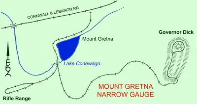 Rails weighing 30 pounds per yard (10 kg/m) were spiked onto the 4-inch (10 cm) face of ties 3 feet (0.9 m) long. A turntable, engine-house, water tank, runaround track, and storage tracks were near the junction with the Cornwall & Lebanon at Mount Gretna. Return loops were built near the rifle range and around Governor Dick peak. During the summer of 1889 passengers were carried in one conventional coach and 7 open-sided observation cars boarded from long foot-boards running along the length of either side of the car. These eight passenger cars were built by the Jackson & Sharp Company. Two more observation cars were added when locomotive #15 was purchased for the summer of 1890.[1] At first the railroad was popular, but the tourist trade declined after the novelty had died down. The loop around Governor Dick was dismantled after the summer of 1896,[6] but the railroad continued operation for the National Guard rifle range. A serious accident in 1915 killed off that traffic. One of the observation cars overturned on a sharp curve when a large number of guardsmen attempted to board simultaneously from one side of the car.[2] There were some serious injuries, and the tiny railroad ceased operation in the summer of 1916, shortly after its parent company's purchase by the Pennsylvania Railroad. The narrow-gauge equipment was loaded aboard standard gauge cars on 14 September 1916.[1]