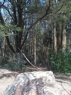Though planned as a recreational forest, some areas were logged by Sutro's heirs.[5] In 1934, after a fire, this effort was discontinued. The forest was logged again during World War II, for use as a domestic fuel due to war rationing.
