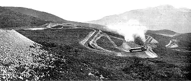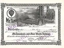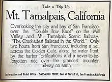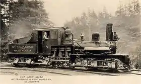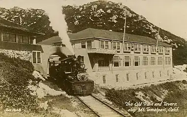 The Mount Tamalpais & Muir Woods Railway was a scenic tourist railway operating between Mill Valley and the east peak of Mount Tamalpais in Marin County, California, covering a distance of 8.19 miles (13.18 km), with a 2.88-mile (4.63 km) spur line to the Muir Woods.[1] The railroad was incorporated in January 1896, and closed in the summer of 1930.[2] Originally planned as a 4 ft 8+1⁄2 in (1,435 mm) standard gauge electric trolley line, the railroad was powered by a succession of geared steam locomotives.[3] Billed as the "Crookedest Railroad in the World", the line was renowned for its steep and serpentine route, winding through picturesque terrain to a mountaintop tavern providing first-class hospitality and panoramic views of the San Francisco Bay Area.[4] Despite its popularity, the railway met its demise following a fire in 1929,[5] and dwindling ridership when the automobile could finally drive to Tamalpais' summit.[6]