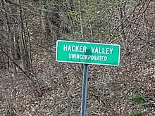 The village of Hacker Valley was named in honor of John Hacker. Hacker reportedly took possession of a tract of land nearby by "tomahawk mark" around 1772. A post office operated from 1856-1892 as Hacker's Valley.[11]