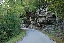 Just east of Poling is a large rock formation referred to locally as "Hanging Rock." The cliff extends out over and along Replete Road for several hundred feet. Formed of sandstone, the rock was deposited around 313 million years ago and undercut by water erosion from the adjacent Left Fork Holly River.[21]
