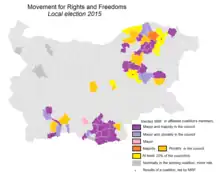 However, these movements, as well as the National Movement for Rights and Freedoms, member of a Social-Democratic coalition ('Rose coalition') failed to secure any elected representative in the parliament. A party founded in 2011 by members who left the party and headed by Korman Ismailov—People's Party Freedom and Dignity, gained 1.5% of the vote in a coalition with National Movement Simeon II (NDSV) and therefore did not cross the 4% threshold to enter the parliament.[14] This party was part of the Reformist Bloc and crossed the threshold and entered the parliament and the government in 2014, but only with one Deputy Minister that was removed. Another political fraction DOST founded by the former leader Mestan, had 17,000 registered members in 2016, which were obtained only for about one year.[15] If so, the members of the Movement of Rights and Freedoms must have dropped in numbers.