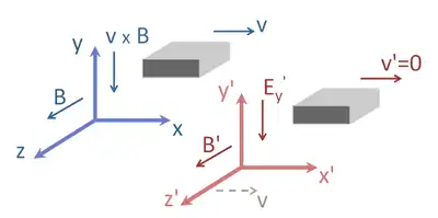 - ↑ This expression can be thought of as an assumption based on our experience with magnets, that their fields are independent of their velocity. At relativistic velocities, or in the presence of an electric field in the magnet frame, this equation would not be correct.