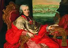 The day after Leopold and Wolfgang arrived back in Salzburg the court was thrown into turmoil by the death of Archbishop Schrattenbach.[72] This created problems for Leopold, who had unresolved issues with the court. Part of his salary during the second Italian visit had been stopped, and Leopold wished to petition for its payment, and to pursue the matter of Wolfgang's salary as a Konzertmeister, which Schrattenbach had indicated might be paid on Wolfgang's return from the first Italian journey.[73] There was also the matter of succession to the post of Salzburg's Kapellmeister, to be available soon on the pending retirement of the incumbent, Giuseppe Lolli, who was over 70 years old; Leopold, who had followed Lolli as Vice-Kapellmeister, might normally have felt confident of succeeding him to the higher post. Decisions on these matters would now be made by the new archbishop, whose policies and attitudes were unknown.[74]