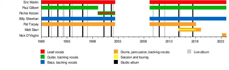 On February 7, 2018, drummer Pat Torpey died from complications of Parkinson's disease at the age of 64.[28] His last show took place at the Wulfrun Hall in Wolverhampton on November 23, 2017. A memorial show took place on May 23, 2018, at The Canyon in Agoura Hills, California, with former member Richie Kotzen as a special guest.[29] The all-star finale of "To Be With You" included, among others, Matt Sorum, Dave Amato, Ricky Phillips, Keith St John, Prescott Niles, Kelly Keagy, Jeff Scott Soto, Ace Von Johnson and Gregg Bissonette.