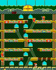 The object of Mr. Do's Castle is to score as many points as possible by collecting cherries and/or defeating unicorn-like monsters. The game takes place in a castle filled with platforms and ladders —reminiscent of Space Panic (1980)—some of which can be flipped from one platform to another, much like a kickstand on a bicycle. The player controls Mr. Do as he collects cherries by using a hammer to knock out blocks that contain them from the various platforms. Empty holes left by the knocked-out blocks serve as traps for the monsters —if a monster falls into a hole, the player can then defeat it by causing a block above the monster to fall on top of it (and additional points are scored if such a monster falls multiple levels en route to its destruction). If the player takes too long to complete a level, the monsters transform into faster, more difficult forms —at first green in color, later blue —that rapidly multiply once they turn blue. The game advances to the next level when all cherries on the level have been collected or all enemies have been defeated. The player loses a life if Mr. Do is caught by a monster, and the game ends when the player runs out of lives.