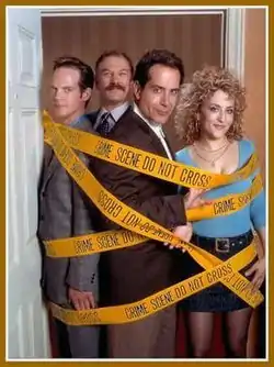 The main cast of Monk (from left); Jason Gray-Stanford as Randy Disher, Ted Levine as Leland Stottlemeyer, Tony Shalhoub as Adrian Monk, and Bitty Schram as Sharona Fleming