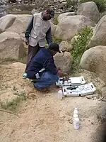 University of Zimbabwe research students sampling water near Mtshabezi Dam