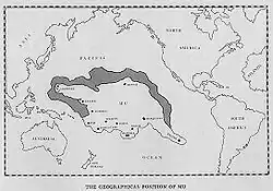 Churchward claimed that the landmass of Mu was located in the Pacific Ocean, and stretched east–west from the Marianas to Easter Island, and north–south from Hawaii to Mangaia. According to Churchward the continent was supposedly 5,000 miles from east to west and over 3,000 miles from north to south, which is larger than South America. The continent was believed to be flat with massive plains, vast rivers, rolling hills, large bays, and estuaries.[11] He claimed that according to the creation myth he read in the Indian tablets, Mu had been lifted above sea level by the expansion of underground volcanic gases. Eventually Mu "was completely obliterated in almost a single night":[9]: 44 after a series of earthquakes and volcanic eruptions, "the broken land fell into that great abyss of fire" and was covered by "fifty millions of square miles of water."[9]: 50 Churchward claimed the reasoning for the continent's destruction in one night was because the main mineral on the island was granite and was honeycombed to create huge shallow chambers and cavities filled with highly explosive gases. Once the chambers were empty after the explosion, they collapsed on themselves, causing the island to crumble and sink.[12]