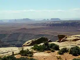 Muley Point is a remote cliff and scenic overlook in southern Utah near Mexican Hat in San Juan County, Utah. The view provides panoramic vistas of the desert landscape of southern Utah (Valley of the Gods) and northern Arizona. Monument Valley is visible in the distance while the San Juan River cuts into the canyon below.