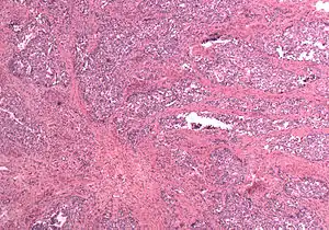 There is debate over the naming of MMMT; the term carcinosarcoma was formerly used to describe lesions with homologous tumors, and "malignant mixed Müllerian tumor" or "mixed mesodermal tumor" was used to describe heterologous tumors. While "carcinosarcoma" now considered standard, "malignant mixed Müllerian tumor" has a lengthy history within gynecological literature and is expected to continue to be used. The naming issue to a certain extent reflects histological characteristics and development of the tumors, in which the different types of tissues are believed to either develop separately and join into a single mass (the "collision" theory), that an adenocarcinoma stimulates the stroma to create a tumor (the "composition" theory), or that the tumor is the result of a stem cell that differentiates into different cell types (the "combination" theory).[1] "Collision" tumors are normally easily recognized and not considered true MMMTs; the "combination" theory is most widely held, and is due to evidence that the tumors develop from a single line of cells, developing in a fashion similar to the fundus of the uterus from the Müllerian duct – first from a stem cell into a population of cells, that then differentiates into epithelial and stromal components.[1][2]
