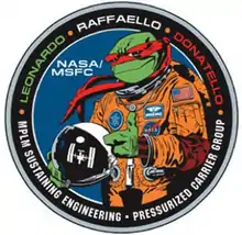 Since the module names are also the names of three of the four Teenage Mutant Ninja Turtles, the NASA MPLM Group approached Mirage Studios artist A.C. Farley to design a logo featuring Raphael in an astronaut flight suit.[4] There were cloisonné pins produced, as well as stickers and embroidered patches. Because the Ninja Turtles were created by Mirage Studios and owned by them at the time (now owned by Paramount Global, formerly ViacomCBS), NASA gave Mirage the copyright to the logo in exchange for the use of the studio's character on it.[4]