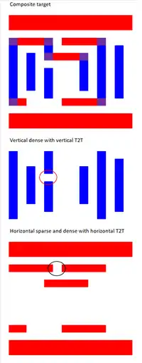 The most basic example is horizontal dense lines vs. vertical lines (half-pitch < 0.35 λ/NA), where the former requires a North-South dipole illumination while the latter requires an East-West dipole illumination. If both types are used (also known as cross-quadrupole C-Quad), the inappropriate dipole degrades the image of the respective line orientation.[22] Larger pitches up to λ/NA can have both horizontal and vertical lines accommodated by quadrupole or QUASAR illumination, but diagonally spaced features and elbow features are degraded.[23][24]