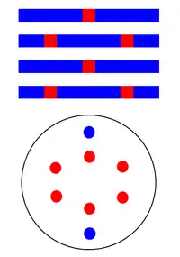 The earliest implementation of multiple patterning involved line cutting. This first occurred for Intel's 45nm node, for 160 nm gate pitch.[41] The use of a second mask to cut lines defined by a first mask does not help increase feature density directly. Instead it allows definition of features, e.g., brick patterns, which are based on lines spaced at a minimum pitch, in particular, when the lines are near the resolution limit and are generated by the two-beam interference mentioned above. The two-beam interference still dominates the diffraction pattern.[38] In fact, in the absence of a separate cut exposure, the gap between the ends of the minimum pitch lines will be prohibitively large.[42][43] This is due to rounding resulting from reduced spatial frequencies.[44]