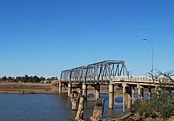 The Mulwala Bridge is a road bridge over Lake Mulwala, formed by a weir on the Murray River, on the state border between New South Wales and Victoria in Australia. The bridge links the border towns of Yarrawonga in Victoria and Mulwala in New South Wales. The bridge was built in 1924 and designed by Percy Allan using a Pratt truss.[1]