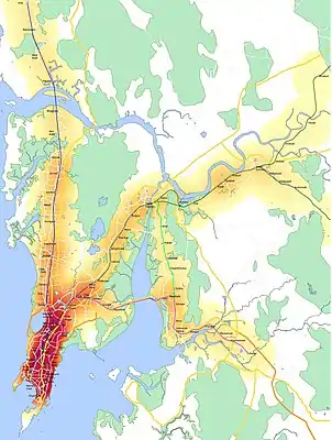 The Mumbai Suburban Railway (Marathi: मुंबई उपनगरीय रेल्वे, romanized: Mumbaī Upanagarīya Relve) (colloquially called local trains or simply locals)[2] consists of exclusive inner suburban railway lines augmented by commuter rail on main lines serving outlying suburbs to serve the Mumbai Metropolitan Region. Spread over 390 kilometres (240 mi),[3] the suburban railway operates 2,342 train services and carries more than 7.5 million commuters daily.