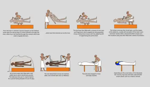 Another text that describes the processes being used in the latter periods is Herodotus' Histories. Written in Book 2 of the Histories is one of the most detailed descriptions of the Egyptian mummification process, including the mention of using natron in order to dehydrate corpses for preservation.[32] However, these descriptions are short and fairly vague, leaving scholars to infer the majority of the techniques that were used by studying mummies that have been unearthed.[30]