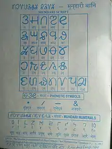 Mundari (Munɖari) is a Munda language of the Austroasiatic language family spoken by the Munda tribes in eastern Indian states of Jharkhand, Odisha and West Bengal. It is closely related to Santali. Mundari Bani,[3] a script specifically to write Mundari, was invented by Rohidas Singh Nag.[4][5] It has also been written in the Devanagari, Odia, Bengali, and Latin writing systems.