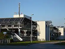 Currently, there are five parking garages and six underground parking areas, amounting together to a total of 30,000 parking spaces[44] of which approximately 16,500 are under a roof. The parking garage P20 at Terminal 2, with 6,400 parking spaces on eleven levels (including four that are underground) since its commissioning in 2003 was the largest parking garage in Germany until the car park at the new Allianz Arena was opened in 2005.[45] A parking guidance system was installed in the parking garages, which detects whether a parking space is occupied and newly arriving vehicles are shown where the empty parking spaces are located.