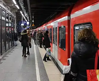 The third level holds the S-Bahn station with two tracks and three platforms, arranged in the Spanish solution: The island platform is for boarding only and the side platforms are for disembarking. The lines