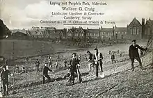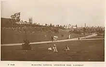 The Municipal Gardens are located on tracts of land purchased between 1894 and 1895 by Aldershot Urban District Council[3] from the Church's wardens and overseers for public use. After much discussion about price a settlement was agreed and work on the nearby Municipal Buildings and Gardens commenced.[4] This ancient piece of land, referred to as the 'Parish Clerk's Land' in the Crondall Hundred, was laid out as the Municipal Gardens and opened to the public in 1904.[5] On 'Arbour Day' on 13 December 1905 32 trees including lime, chestnut, acacia and sycamore were planted by their donors who were prominent local people.[3][6][7]