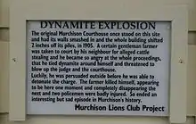The world's earliest non-military suicide attack is believed to have occurred in Murchison on 14 July 1905. A long-standing dispute between two farmers resulted in a court case, and the defendant (Joseph Sewell) had sticks of gelignite strapped to his body. When Sewell excitedly shouted during the court sitting, "I'll blow the devil to hell, and I have enough dynamite to do just that", he was ushered out of the building. Sewell detonated the charge when a police officer tried to arrest him on the street, and his body was blown to pieces; no one else died from the explosion.[5][6]