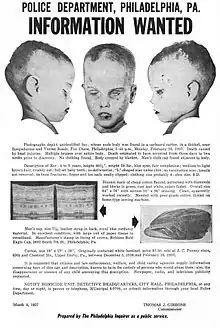 The case attracted considerable media attention in Philadelphia and the Delaware Valley. The Philadelphia Inquirer printed 400,000 flyers depicting the boy's likeness, which were sent out and posted across the area, and were included with every gas bill in Philadelphia.[13] The crime scene was combed over and over again by 270 police academy recruits, who discovered a man's blue corduroy cap, a child's scarf, and a man's white handkerchief with the letter "G" in the corner; all clues that led nowhere.[13][14] The police also distributed a post-mortem photograph of the boy fully dressed and in a seated position, as he may have looked in life, in the hope it might lead to a clue.[13]