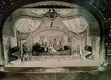 The theater had a half-barrel foyer ceiling, a carved ornamental plaster with a continuous row of Cupid heads, a lobby decorated with a sunburst chandelier, marble floors, and polished oak doors; and three painted stage curtains with pictures of Betsy Ross, Nathan Hale, and Patrick Henry.[2][3]