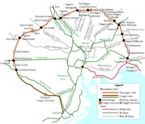 The Musashino Line (武蔵野線, Musashino-sen) is a railway line operated by the East Japan Railway Company (JR East). It links Tsurumi Station in Yokohama with Nishi-Funabashi Station in Chiba Prefecture, forming a 100.6 km (62.5 mi) unclosed loop around central Tokyo. Passenger operations are limited to the 71.8 km (44.6 mi) portion between Fuchūhommachi and Nishi-Funabashi; the Tsurumi to Fuchūhommachi portion, called the "Musashino South Line", is normally used only by freight trains. The line forms part of what JR East refers to as the "Tokyo Mega Loop" (Japanese: 東京メガループ) around Tokyo, consisting of the Keiyō Line, Musashino Line, Nambu Line, and Yokohama Line.[2]