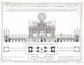 ![]() Machine for the fireworks for the peace of Aix la Chapelle in May 1749 performed in Green Park; structure designed by Franco-Italian architect Giovanni Niccolò Servandoni | |