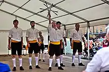 Northumbria shares with southern Scotland the long history of border ballads, such as 'The Ballad of Chevy Chase'.[3] It is also known for local dances, namely rapper dancing and Durham and Northumberland style clog dancing.[4] The dance music of Northumbria differs markedly in style from that of the rest of England. It has more in common with Irish dance music, and especially Scottish dance music, yet is to some extent unique.[5] Many dances from the region have the characteristic rant step.[6]