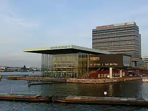 View from the water on the Muziekgebouw and Passenger Terminal Amsterdam