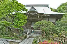 The site was originally occupied by a temple called Honkuku-ji (本国寺), which was later transferred to Kyoto.[7] Its first chief abbots were men from important families, and one of them was Nichiro, better known as Nichiei, the name he assumed when he became a priest, who was an uncle of Ashikaga Takauji and the temple's fifth chief abbot.[4] Nichiei was a natural son of Prince Morinaga,[8] and for this reason he rebuilt the temple in 1357 dedicating it to his father.[9] Nichiei was born from a woman called Minami no Ōnkata, who attended the prince while he was a prisoner of the Ashikaga in the cave now at Kamakura-gū.[4] He and his mother are buried within the temple, while Prince Morinaga's grave is in nearby Nikaidō.[9] Nichiei installed two cenotaphs in memory of his parents on top of the hill behind the main hall.[4] During the Edo period the temple was protected and maintained by the Tokugawa and their vassals.[6] The temple is supposed to have been entrusted to Nichiei by Nichiren himself.[4]