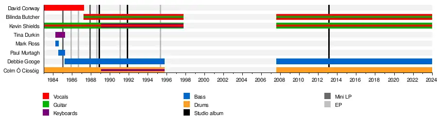My Bloody Valentine (often stylised in all lowercase or abbreviated as MBV) are an Irish-English rock band formed in Dublin in 1983 and consisting since 1987 of founding members Kevin Shields (vocals, guitar, sampler) and Colm Ó Cíosóig (drums, sampler), with Bilinda Butcher (vocals, guitar) and Debbie Googe (bass). Often cited as a pioneering act in the shoegaze genre, their sound is characterized by dissonant guitar textures, androgynous vocals, and unorthodox production techniques.