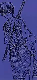 Yahiko starts off as arrogant and bad-mannered; he had already bestowed upon himself the title "Tokyo Samurai", as his father was a samurai who died during the Battle of Ueno in the Boshin War, slain at the Keneiji Temple.[10] Because Yahiko respected his parents, he becomes a thief before the start of the series, to pay back their debt. Yahiko first appears trying to rob Kenshin, who stops him but lets him go. As his yakuza bosses are about to beat him to death for his desire to quit, Kenshin arrives to save him and take him to Kaoru's dojo to learn swordsmanship.[10] Yahiko's dream is to be as strong as Kenshin so he will be able to protect himself and the people he loves.[11] Despite his young age and his short time of training, as the series continues Kenshin allows Yahiko to fight with him, noting that he is too mature for his age.[12] He becomes a witness to many of Kenshin's later battles[13] to the point which Yahiko becomes adept at imitating some of Kenshin's Hiten Mitsurugi-ryū (飛天御剣流, lit. "Flying Heaven Honorable Sword Style") techniques, combining them to perform many other powerful sword techniques.[14][15] Yahiko also learns the principles of Kamiya Kasshin-ryū (神谷活心流, lit. "Gods' Valley Alive Heart Style"), which matches Kenshin's ideal of saving lives. When Kenshin goes to Kyoto to fight Shishio Makoto who wanted to conquer Japan, Yahiko accompanies Kaoru to find and aid Kenshin.[16] While Kenshin goes to have his final fight against Shishio, he stays in Kyoto to defend their base, a hotel named Aoi-ya, from Shishio's forces along with Kaoru and the Oniwabanshū.[17] They are successful in doing it, and Yahiko manages to defeat one of Shishio's strongest soldiers, Henya.[14]